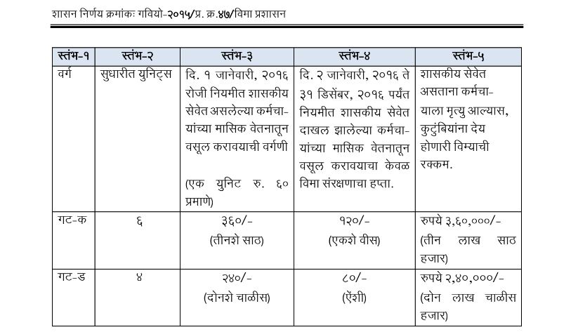 ५) शासन निर्णय – गट विमा योजनेच्या वर्गणीत वाढ करणे बाबत दिनांक ३० जानेवारी २०१६ नुसार – राज्य शासकींय कर्मचारी गट विमा योजना वर्गणीचे दर सातवा वेतन आयोग लागू करण्यात आल्या नंतर खालील प्रमाणे. सदर दर दिनांक १ जानेवारी २०१६ पासून लागू करण्यात आले आहेत.